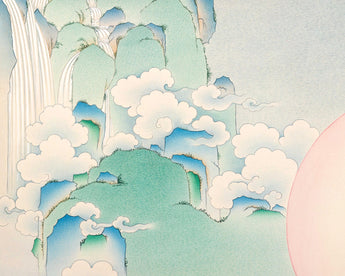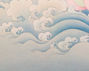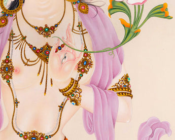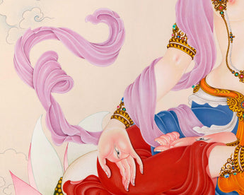 Our artist portrays the long-life bodhisattva white tara in this digital print thangka. She is glowing white like a stainless moon with seven eyes (three on her face, two on her palms, and two on her legs). She is seated on a lotus seat in a mild form, on the water flowing from the mountains. She holds a fully bloomed lotus, which means the day on her left hand, and her left hand is in granting mudra. White Tara embodies elegance, peace, and a mother's love for her child. She looks divine with the precious ornaments and the lavender-colored long scarf flowing through her body.