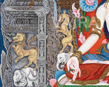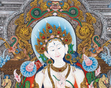 Immerse your sacred space in the divine aura of compassion and healing with our White Tara Thangka Print. This exquisite masterpiece goes beyond tradition and becomes a channel for spiritual energy. Finely printed on premium quality canvas for longevity and vibrant colors, White Tara appears on the painting in a calm state of reflection, radiating an infinite amount of love. Gracefully place it in your healing or meditation area to cultivate a tranquil atmosphere, kindly invoking White Tara's compassionate energy to guide you on your path to spiritual awakening and inner peace. This thangka print serves as a sacred focal point, kindly inviting the gifts of compassion into your life. It warmly serves as a humble companion for moments of meditation, introspection, and holistic healing, extending its support for your well-being.