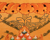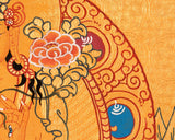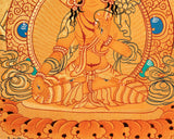 She is shown sitting in meditation, her right hand providing good fortune and her left holding a utpala flower, representing purity. Her seven eyes on her body - one on her forehead, one on each palm, and one on each foot - stand for her omniscient vision, enabling her to see all sentient beings' suffering and bestow blessings to reduce it. The cool, calm hues of her clothing exude serenity and tranquility, while the orange and gold background highlights her celestial presence. This Thangka is perfect for any sacred area, acting as a beautiful spiritual relic and a strong support for meditation and healing.