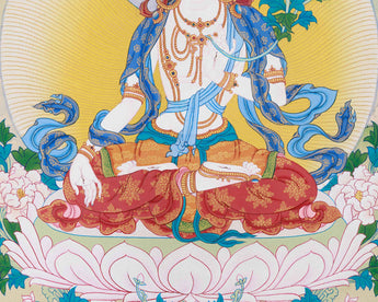These vibrant Long-Life Deities—White Tara, Namgyalma, and Buddha Amitayus—reflect the enduring beauty and profound spiritual meaning of Tibetan Buddhist art. Painted by hand in the traditional Karma Gadri style, this piece utilizes natural stone pigments and features authentic 24K gold embellishments. The earthy tones of the natural stone colors give the painting a warm, grounded feel. At the same time, the gold accents emphasize the divine and sacred essence of the deities, imparting a radiant appearance.