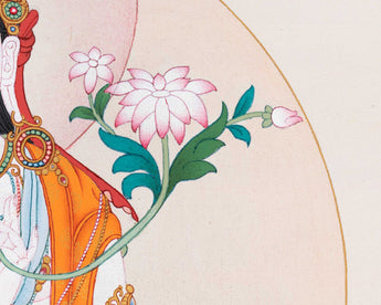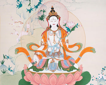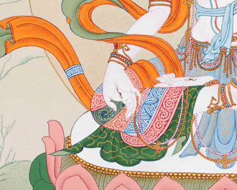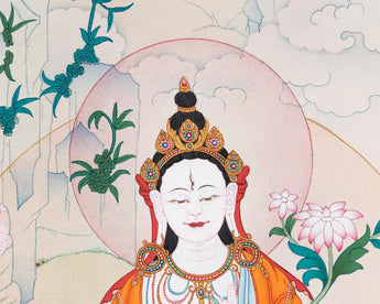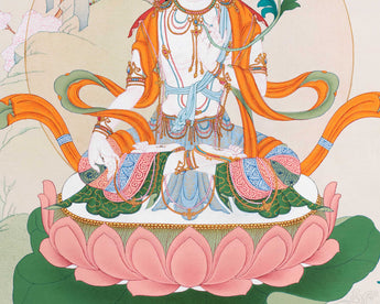 This Divine Goddess White Tara Thangka is meticulously handpainted, showcasing intricate and vibrant details. Representing the goddess of compassion, healing, and peace, it serves as a powerful reminder of these qualities in one's daily life. Perfect for meditation and spiritual practice.