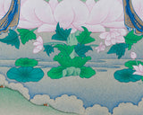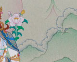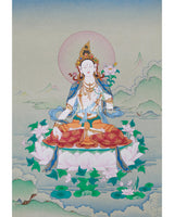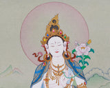 The Female Buddha of Longevity, White Tara, is portrayed with serene grace, symbolizing healing, compassion, and the blessing of a long life. The natural stone colors create an earthy palette that links the artwork to the spiritual legacy of Tibetan Buddhism. The addition of 24K gold accents heightens the divine presence of the deity, representing purity and enlightenment. Hand-painted on durable cotton canvas, this artwork ensures lasting vibrancy and fine detail. The materials used in the thangka are carefully chosen to preserve the artwork's visual beauty while also reflecting the sacred symbolism of the Female Buddha.