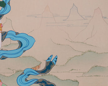 The Female Buddhist White Tara Thangka radiates serene grace and spiritual significance, depicting the goddess of compassion, healing, and longevity. The canvas is made of cotton, providing a sturdy base for the artwork. The thangka is hand-painted with acrylic colors, which offer vibrant hues while capturing every detail. Painted in the delicate Karma Gadri style, this thangka features an immense composition and soft, flowing details that enhance its meditative presence. Genuine 24K gold is added to the thangka, accentuating the sacred symbols and enhancing the piece's spiritual vitality.