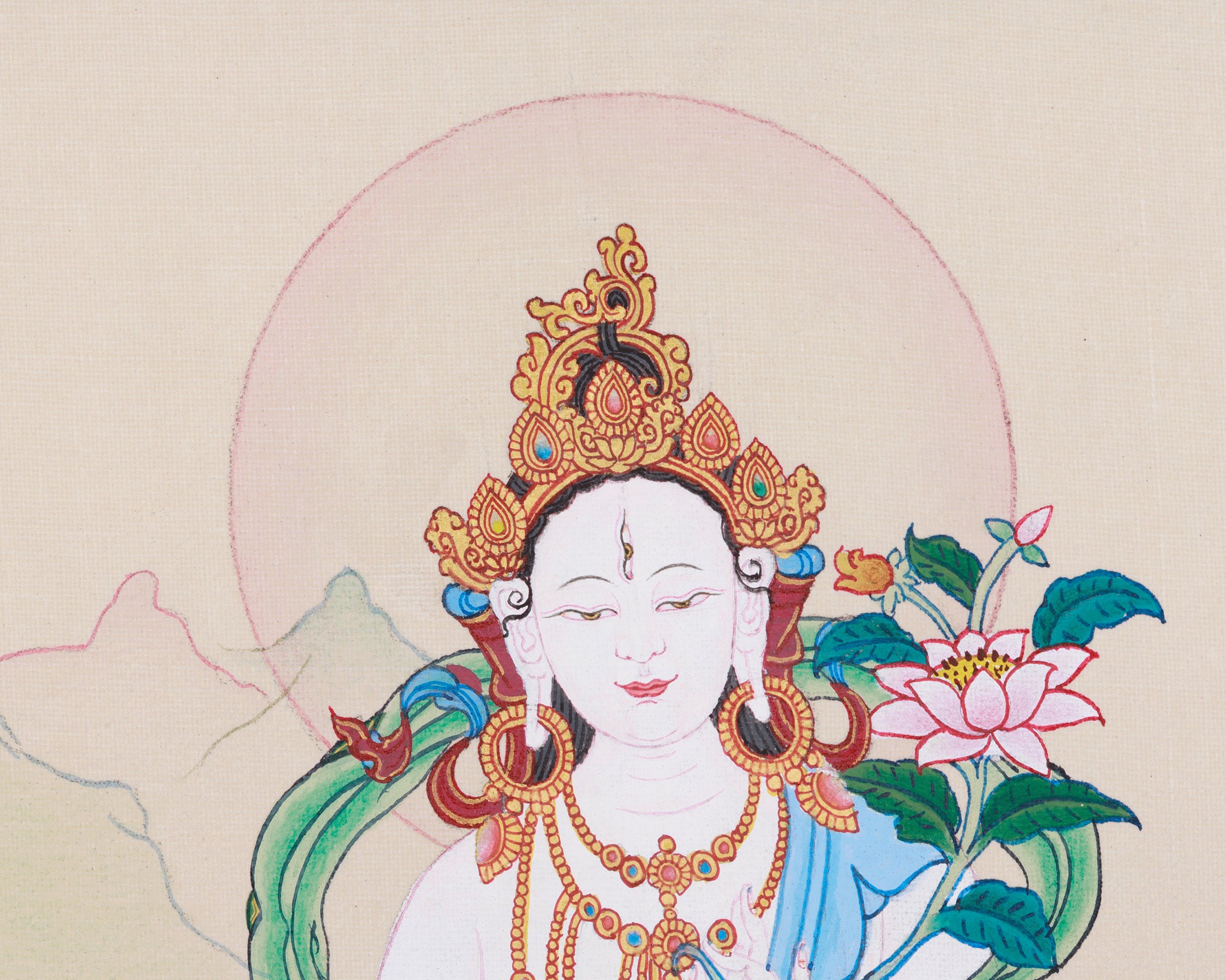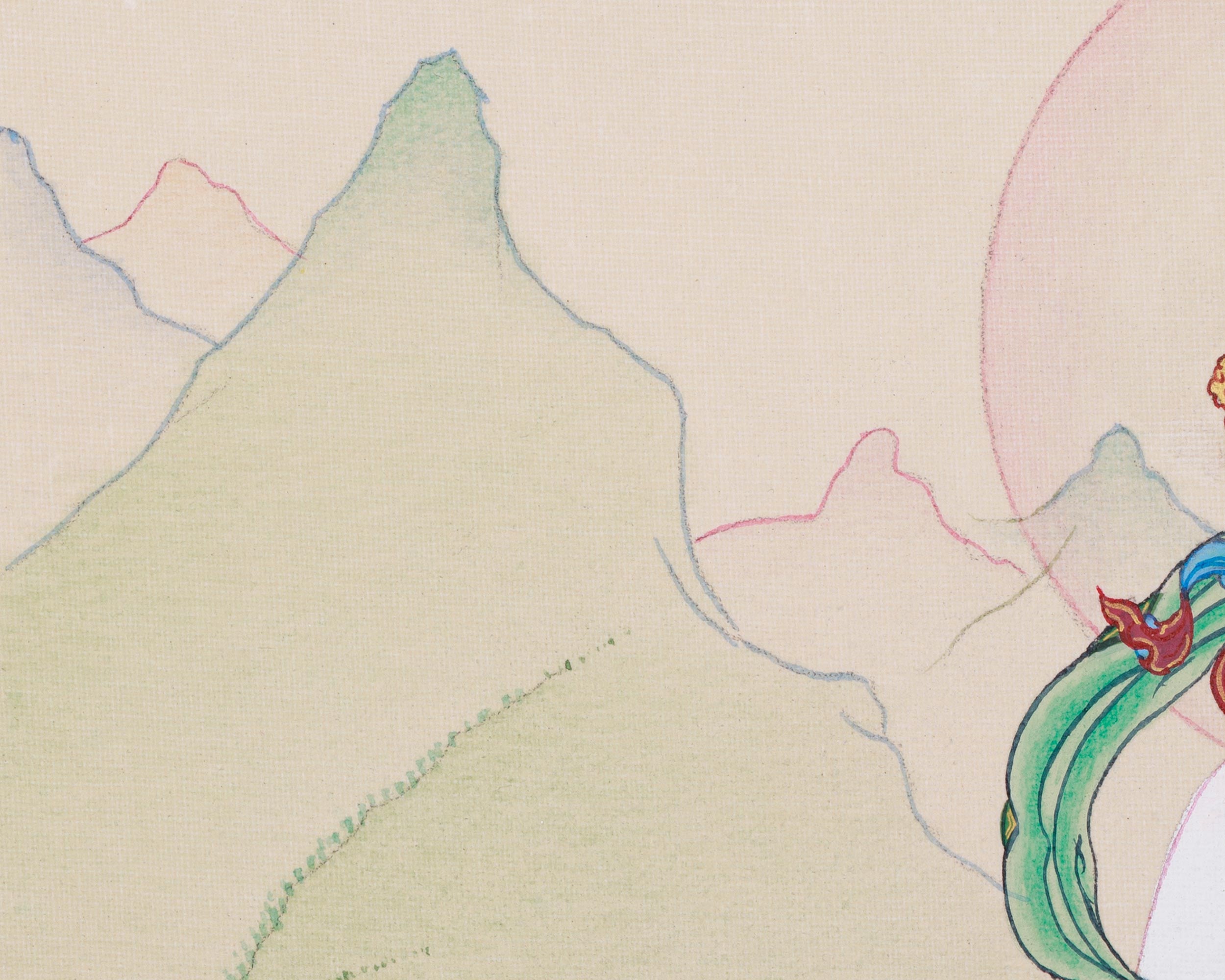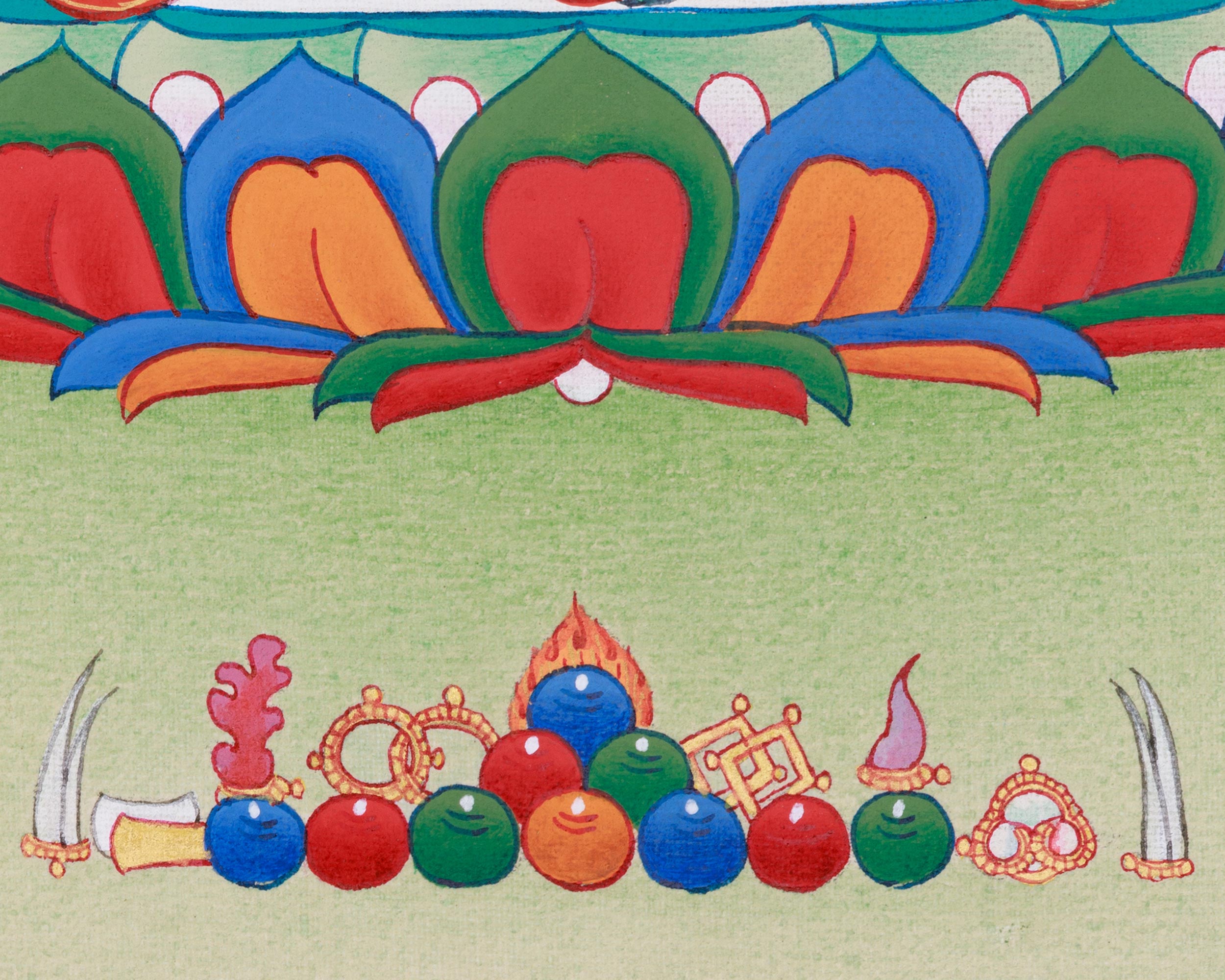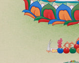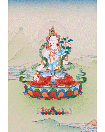 Holding a lotus blossom in her left hand and her right hand in a varada mudra, she offers blessings to anyone seeking her advice. The thangka's background features a soothing blend of soft greens, accented by delicate hills that foster a tranquil, serene ambiance. She is seated on a lotus base, a symbol of purity. The delicate lotus petals that surround her add to the painting's beauty. This spiritually powerful artwork is for altars, meditation rooms, or anybody looking to evoke Tara's compassionate guidance and protective energy.