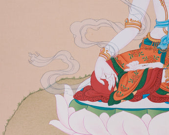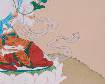 This thangka, painted in the Karma Gadri style, embodies elegance and spiritual harmony. Its soft color palette, natural landscapes, and open composition reflect the vastness of enlightened space. The simplicity of the background enhances White Tara's luminous form, creating an ethereal setting that evokes a sense of peace and serenity. This minimalist approach is deeply rooted in Tibetan monastic teachings and meditative aesthetics.
