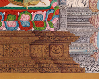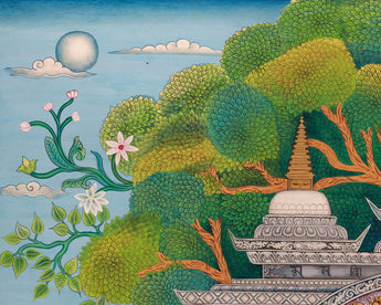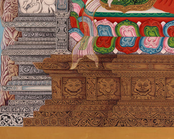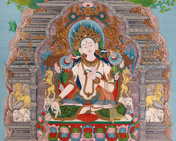 Hand-painted on cotton canvas, a durable and traditional medium that guarantees the artwork's longevity. Acrylic colors add richness and depth to the painting, while genuine 24K gold accents give it a brilliant, celestial aspect. From the elaborate throne to the deity's adornment, the gold detailing captures the sublime grandeur and purity of White Tara. Because of the artist's commitment and use of traditional methods, this piece of art will always be valued.