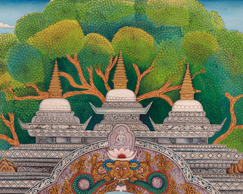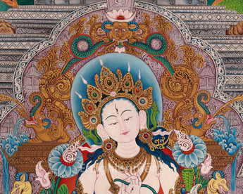 White Tara is portrayed sitting on an elaborate throne, demonstrating the artist's expertise. The throne is adorned with elaborate details, such as stupas at its summit, which represent the interdependence of all beings and the road to enlightenment. She is in the vajra pose, which symbolizes her unwavering commitment and sublime meditation.