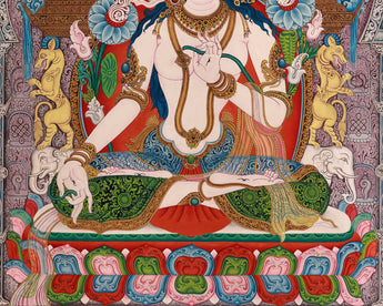 The thangka painting depicts the infinite grace of White Tara, the revered Mother of All Buddhas. White Tara, a symbol of compassion, healing, and longevity, exudes peace and enlightenment while bestowing blessings on all beings. This masterpiece blends artistic brilliance and profound spiritual symbolism, making it an important addition to any sacred place or collection.