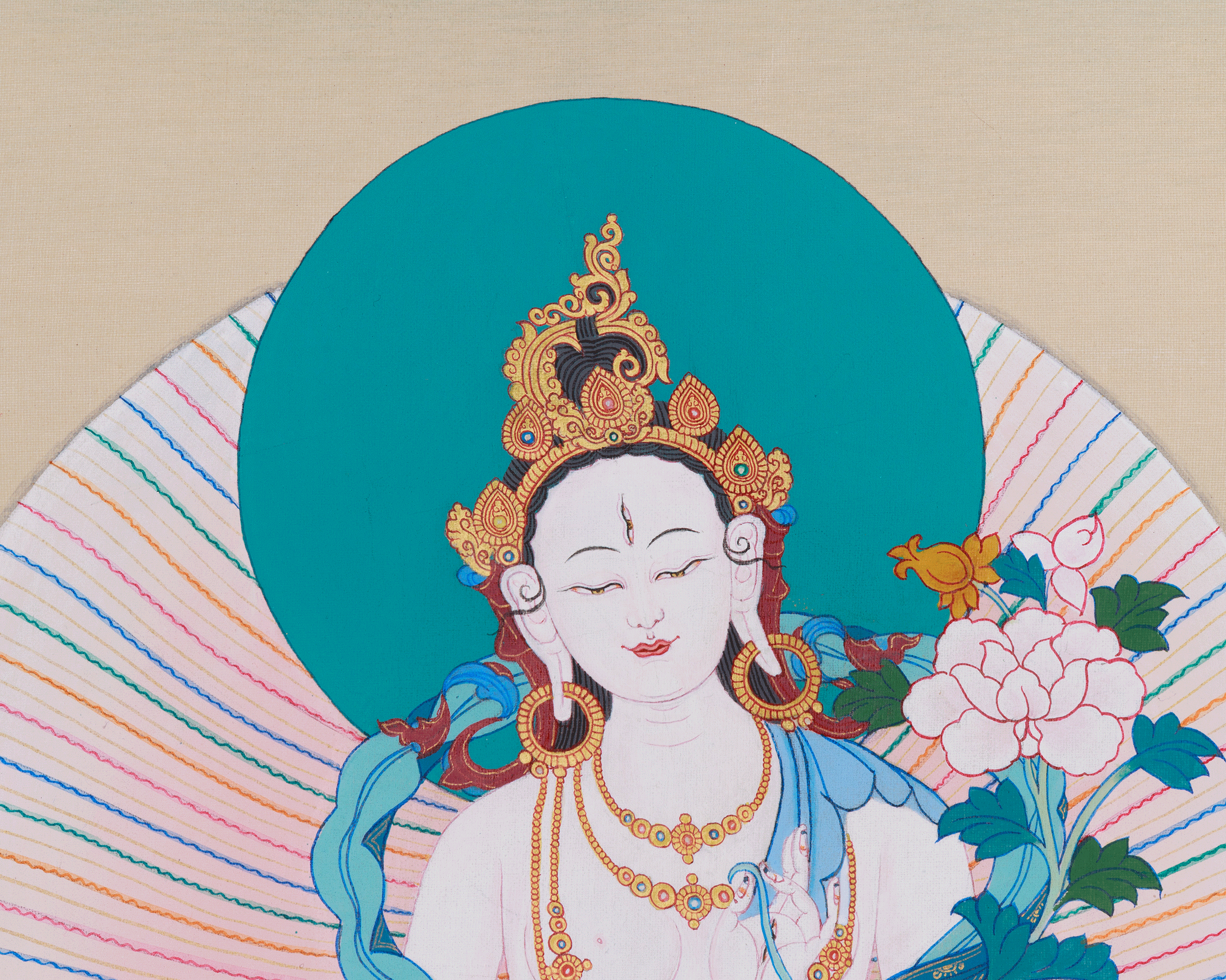 Following the traditional Karma Gadri style, this Sacred Three Long-Life Deities Thangka represents an exquisite work of art. It is carefully hand-painted using acrylic colors and decorated with authentic 24K gold. White Tara, positioned centrally, embodies compassion and healing. Flanking her, Amitayus and Namgyalma enhance the auspicious symbolism of longevity, health, and spiritual purification. This elegant thangka, with its vibrant colors and intricate patterns, functions as a harmonious and spiritually powerful focal point for any meditation altar or sacred space.