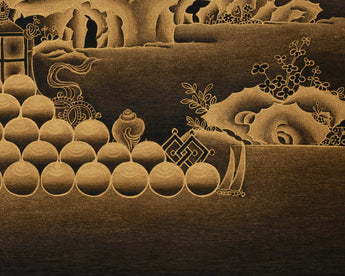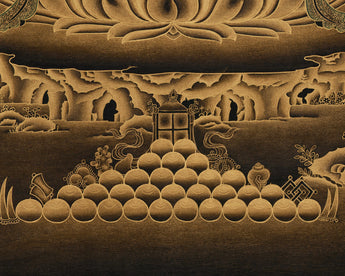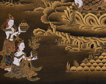 Nakthang is a cherished style in Tibetan art, celebrated for its striking contrast between gleaming gold and the rich, deep black canvas. This unique approach symbolizes the eternal light of wisdom emerging from the depths of ignorance. Against the dark backdrop, the gold details illuminate brilliantly, representing the power of enlightenment that conquers the shadows of worldly attachments.