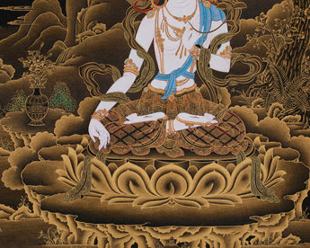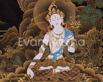 This Tibetan Goddess White Tara Thangka is a stunning masterpiece, lovingly hand-painted with vibrant acrylic colors and 24K gold on premium cotton canvas. Created in the renowned Nakthang (Gold on Black) style, this painting beautifully blends wisdom and enlightenment with the allure of the unknown. The cotton canvas serves as a strong base for the gentle layers of acrylic paints, while the radiant 24K gold brings out the goddess's divine presence. The gold accents, adorning her lotus throne, halo, and other sacred elements, add a sense of spiritual depth, enhancing the piece's holy energy.