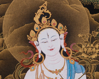 Grace and Protection: Tibetan Goddess White Tara Thangka | Painted in Nakthang (Gold on Black) Style