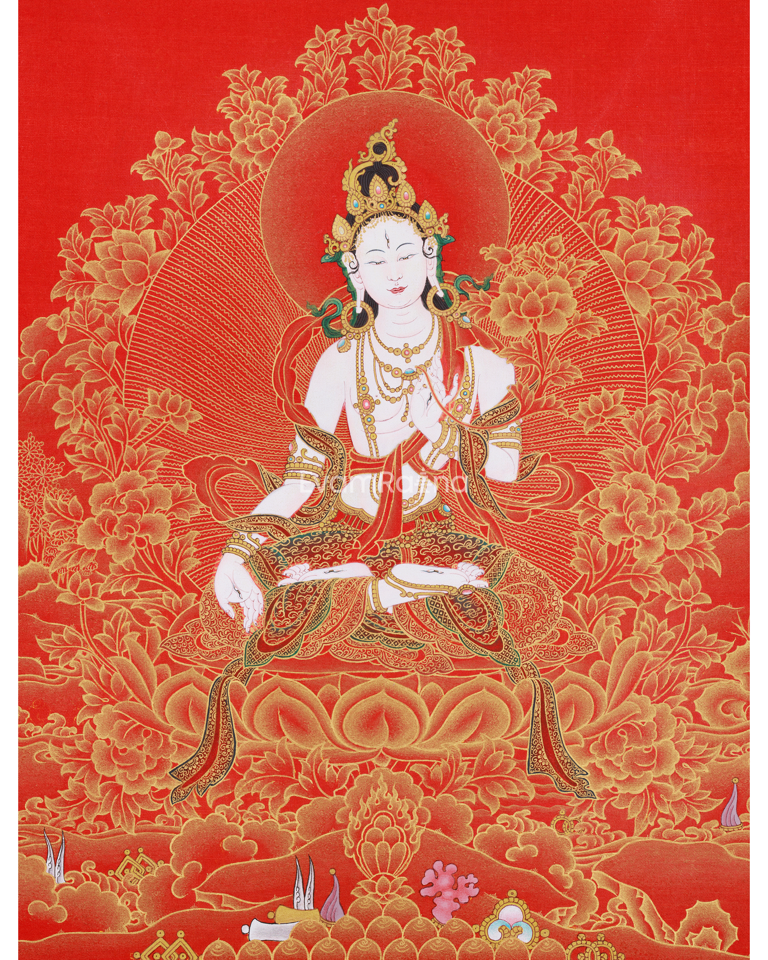 Original Hand-Painted Tibetan Healing Goddess White Tara Thangka | Gold on Red Artwork Radiating Healing Energy and the Blessings of Longevity