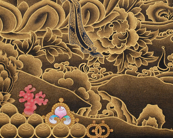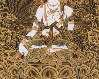 Discover an exquisite Tibetan White Tara Goddess Thangka, beautifully hand-painted on high-quality cotton canvas using vibrant acrylic colors and enhanced with genuine 24K gold. Created in the Nakthang (Gold on Black) style, this painting features radiant golden lines that bring the deity to life against a black background, symbolizing the harmony of wisdom and emptiness. With their intricate floral designs, shimmering details, and the golden lotus throne, the jewelry and robes embody the workmanship of this unique tradition. The result is a breathtaking and spiritually significant work of art that resonates deeply with the heart.