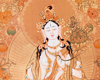 About Our ThangkaEmbrace White Tara's serene presence with the help of this gorgeous thangka that was lovingly hand-painted. The beautiful white complexion and delicate facial features of the deity are highlighted in great detail by the Full Gold style. White Tara rests serenely atop a lotus throne, exuding a sense of peace and tranquility as the essence of compassion and healing. The painting's elaborate iconography further emphasizes the statue's spiritual significance. Every brushstroke is evidence of the artist's commitment and labor of love in producing a work of art that radiates grace and beauty. Displaying this White Tara thangka will allow you to draw the goddess' healing and compassion-filled blessings into your life.