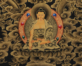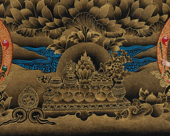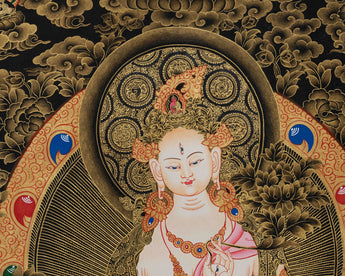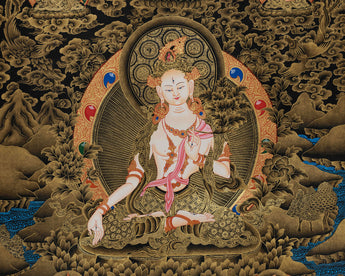 An exquisite piece of Tibetan sacred art, the Traditional Sita Tara thangka, is masterfully created on a rich black canvas. Hand-painted using acrylics and real 24K gold, this artwork showcases both devotion and exceptional craftsmanship. Every brushstroke and decorative detail is intentionally designed to provide a rich texture and depth. The background's complex floral motifs and cloud patterns symbolize Tara's pure realm, embodying wisdom and protection.