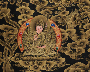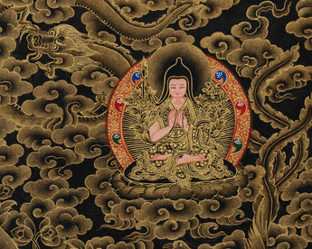 Surrounding White Tara are significant figures; Guru Rinpoche, the legendary master, offers divine protection; Shakyamuni Buddha, the historical Buddha, embodies the path to enlightenment; Tsongkhapa, the reformer, represents wisdom and discipline; Amitayus, the Buddha of Infinite Life, grants longevity and spiritual prosperity; and Namgyalma is known for her purification and blessings. Together, these figures create a powerful, harmonious assembly of wisdom, protection, and longevity, making this thangka a profound piece for spiritual connection and meditation.