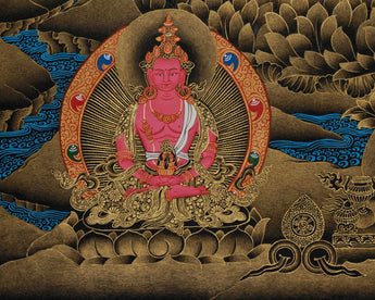 At the heart of the thangka, Sita Tara, also called White Tara, embodies longevity, compassion, and healing. She is draped in exquisite golden robes that sparkle with intricate designs, showcasing her divine elegance. Her seven eyes; three on her face and four on her palms and feet, represent her all-seeing wisdom and constant guidance. She holds a blue utpala flower in her left hand, symbolizing purity and enlightenment, while her right hand is raised in a gesture of generosity. A significant detail in her crown features Amitabha Buddha, highlighting her profound connection to wisdom and enlightenment.
