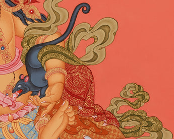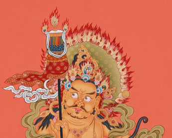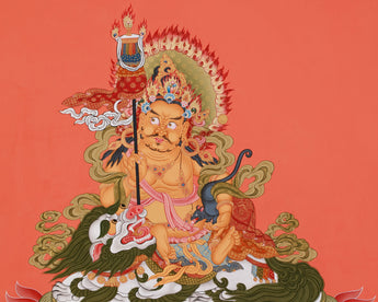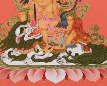 This magnificent Wealth Deity Namtoshe Thangka depicts the powerful presence of one of Tibetan Buddhism's respected guardians of prosperity and morality. He is depicted seated on a snow lion, symbolizing courage and strength. His intense gaze and blazing halo represent his capacity to overcome inner and exterior difficulties, making him an effective protector of both spiritual and material wealth. Carefully hand-painted on high-quality cotton canvas, this exquisite thangka preserves the rich traditions of Tibetan creativity. Authentic 24K gold provides a celestial brightness that symbolizes wisdom and enlightenment, while vibrant acrylic colors highlight its depth and delicate details.