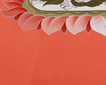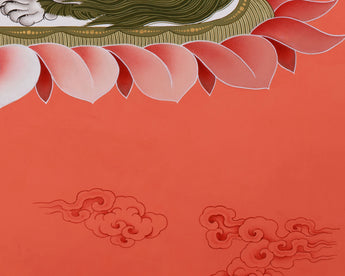 In his right hand, he holds a victory banner, symbolizing triumph over negativity. In his left hand, he holds a mongoose that releases precious gems, signifying prosperity and abundance for those on the righteous path. The gentle red background, which is unusual for most thangkas, enhances the deity's transformational and protective powers while adding a unique vibrancy. The excellent quality of the thangka is demonstrated by the detailed depiction of the ferocious lion, flowing silks, and jeweled embellishments. For both practitioners and collectors, Namtoshe is a significant spiritual treasure because of its reputation for protecting houses and sacred places, bringing wealth, and balancing karmic winds.