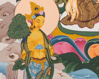 Every detail of a painting has a symbolic meaning. Regardless of your religious affiliation, a thangka can help you on your path to enlightenment, whether you practice Buddhism or have other religious convictions. Thangkas are paintings that depict deities with various iconographic elements and symbolism that encourage meditation on the teachings of the god they depict. Any thangka is intended to aid in removing the film of ignorance, which is a significant barrier to the road to enlightenment. The Thangka is revered as a holy item. They promote positivity, spread Buddhism's teachings, bring about peace, harmony, and oneness, and dispel any negative energy that may be there.