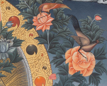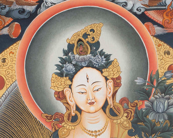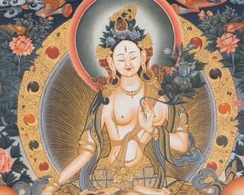 White Tara (Skt. Sita Tara) is also known as Saptalocana Tara, the 'Seven-eyed Saviors', and along with Amitayus and Ushnishavijaya she appears as one of the three principal Buddhist deities of longevity. Her meditational practices are mainly employed to confer long-life, alleviate illnesses, and to remove the obstacles that are indicative of an untimely death. Thangkas of White Tara and the 'Trinity of Long-Life Deities' are frequently commissioned for such purposes, and also to auger an auspicious rebirth for a deceased relative or friend.