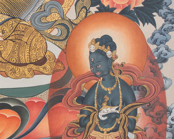 White Tara sits gracefully in vajra-posture upon her moon disc, lotus seat and enlightenment throne. She is youthful and beautiful, with full breasts and a sweetly smiling face. Her radiant white body is adorned with seven bow-shaped eyes; with the three eyes of her face representing the perfection of her body, speech and mind; and the four eyes in her palms and soles representing the 'Four Immeasurable' of her boundless compassion, loving kindness, sympathetic joy, and perfect equanimity. With her lowered right hand she makes the boon-granting varada-mudra of supreme generosity, while she gently holds the stem of an immaculate white lotus between her thumb and third finger. And with her left hand she makes the abhaya-mudra of protection or granting refuge, while she likewise holds the stem of another white lotus in front of her heart