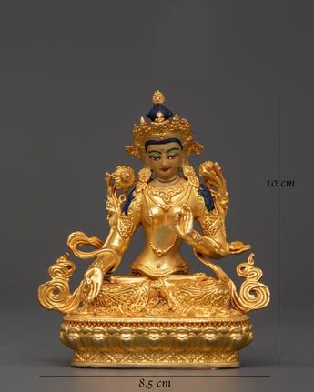 This Divine White Tara statue is a stunning representation of the Tibetan Goddess of Compassion. This statue, handcrafted from copper and finished with radiant gold plating, depicts White Tara seated on a lotus moon disc in a serene attitude. It is the ideal addition to your sacred shrine or meditation area because of the exquisite craftsmanship that highlights her calm and caring presence. This small yet powerful statue, measuring 10 cm in height and 8.5 cm in width, looks excellent in any spiritual setting and raises the vibrations in your space.