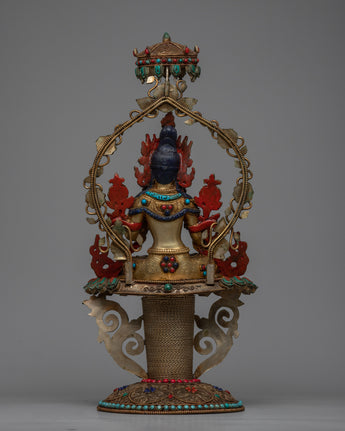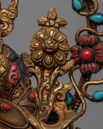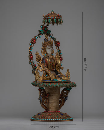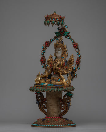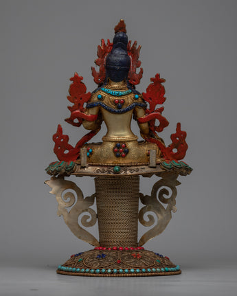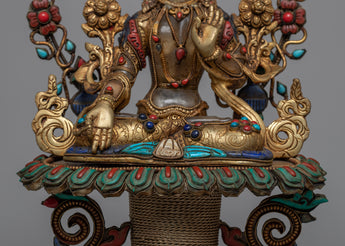 The 24k gold-plated part of the statue is made up of copper, which gives it an opulent appearance and represents the goddess's bountiful and divine blessings. The White Tara Statue represents compassion, healing, and spiritual well-being while sitting atop a lotus base.