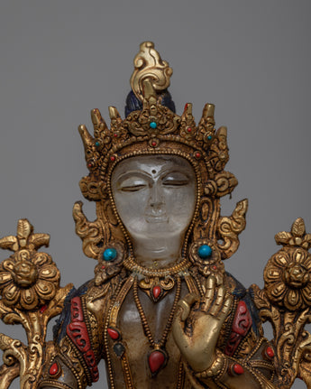 In Buddhist tradition, the Goddess White Tara Statue is a highly respected representation of purity and compassion. This statue, which is handcrafted with great attention to detail, depicts a crystal deity with a calm, ethereal presence. Encrusted with priceless stones like turquoise, coral, and lapis lazuli, it exudes a feeling of holiness and respect.