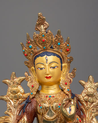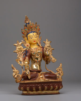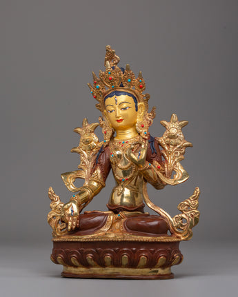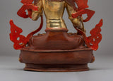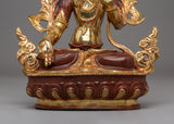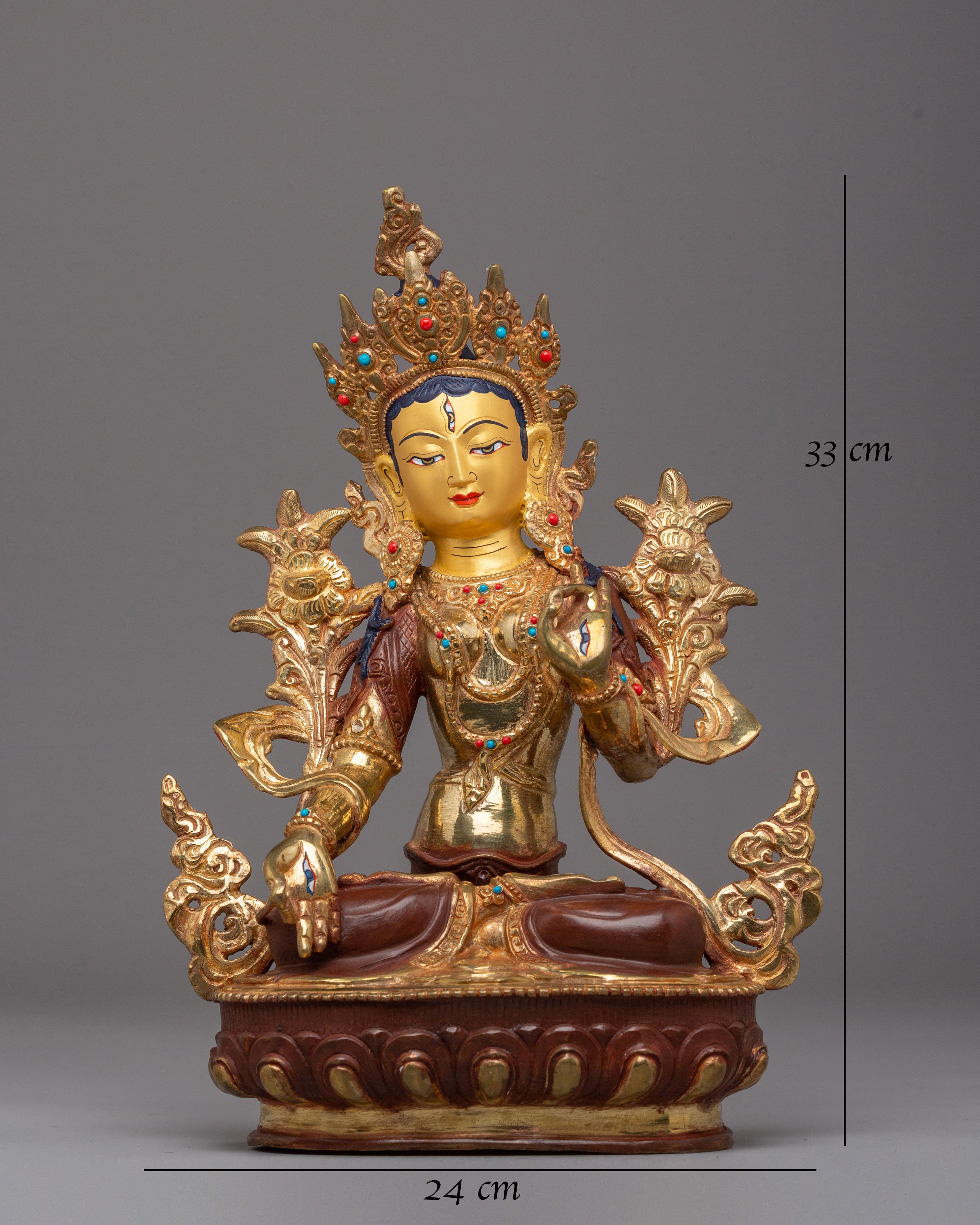 The Handmade Tibetan White Tara Artwork, a symbol of compassion, healing, and longevity, radiates divine grace and spiritual blessings. This wonderfully handcrafted statue, measuring 33 cm (Height) x 24 cm and weighing 2.66 kg, is made of copper with 24K gold gilding. This figure, crafted by talented Nepalese artisans, symbolizes the spiritual traditions of Himalayan Buddhism, making it a valuable addition to altars, meditation spaces, or sacred collections.