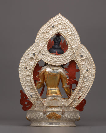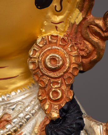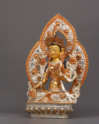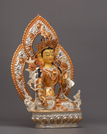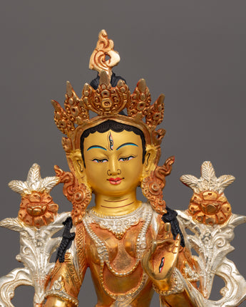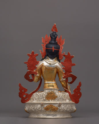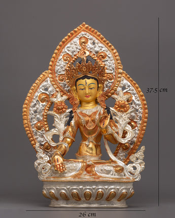 Celebrate wisdom and compassion with this Handmade White Tara Goddess Statue, meticulously carved on a delicate copper body. This magnificent statue, which stands 37.5cm tall and 26cm wide, is electro-plated with gold and silver finishes and accentuated with brilliant acrylic paint to highlight the finer features. White Tara, the goddess of longevity and healing, is pictured as calm and loving, exuding serenity and well-being. Her delicate features and ornate accents highlight the exceptional craftsmanship of experienced craftspeople.