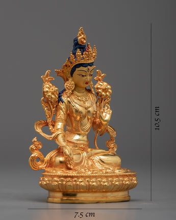 Experience the ethereal beauty of the Machine Made White Tara Statue. Precision-crafted on a solid copper foundation, this statue is further accentuated with lustrous 24k gold plating. Weighing in at 0.214kg, its tangible heft mirrors its spiritual significance, making it a magnificent piece that marries modern craftsmanship with ancient reverence.