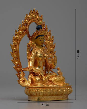 Featuring an exquisitely crafted 11cm copper body, this White Tara Statue will bring a sense of peace and kindness to any area. This little statue of White Tara, who is revered for her calming and healing energy, is exquisitely rendered. Its dimensions are ideal for adding serenity to any area or for use as a personal altar.