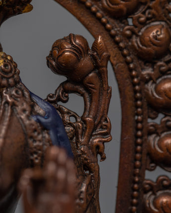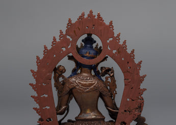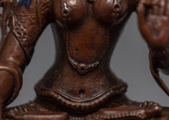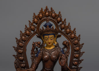 The sculpture of White Tara was traditionally created using a machine. We have represented a deity in this Tibetan statue with a calm countenance sitting on a moon disc lotus seat. She holds an utpala in each hand while doing the earth-touching mudra with the right hand and the Vitarka with the left. This figure may be used for various things, such as Buddhist rites and daily yoga or meditation practices. We used oxidized to create the body. We have gilded the face using genuine 24K gold.