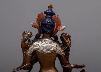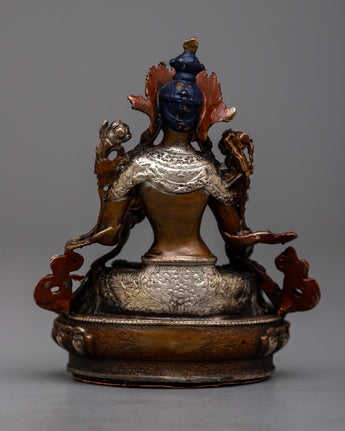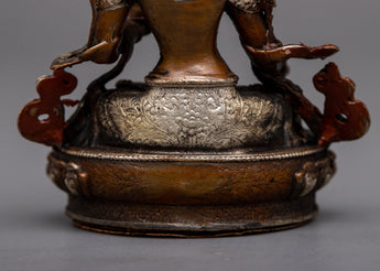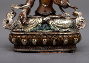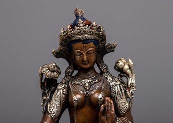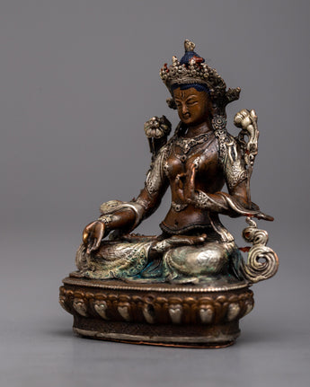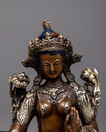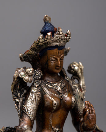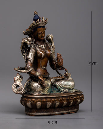 Discover the Small Machine Made White Tara Statue, a representation of longevity, healing, and serenity. Standing at 7cm in height, this magnificent item is finely fashioned on an oxidized copper body and embellished with a delicate silver plating. The statue's rusted copper gives depth and character, while the silver plating highlights White Tara's calm and kind nature.