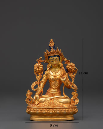 This stunning Tara in Lotus Pose statue perfectly portrays the essence of White Tara, a symbol of compassion, healing, and longevity in Tibetan Buddhism. This statue measures 11cm in height, 8cm in width, and weighs 0.21kg. It is made of copper and has a gold-plated exterior, ensuring a beautiful appearance. White Tara's tranquil and graceful position represents peace, knowledge, and the power of healing, making it an excellent addition to any spiritual or meditation room. Her seated stance on a lotus, a symbol of purity and enlightenment, exudes positive energy and calm.