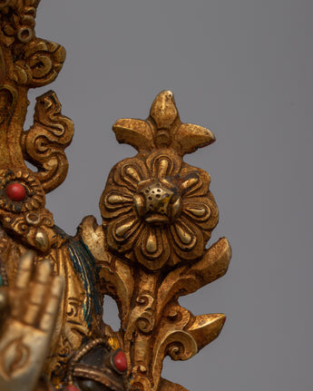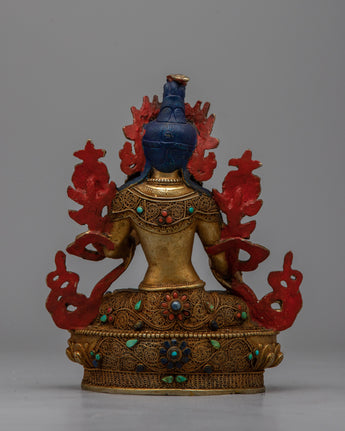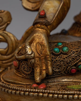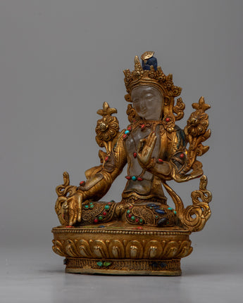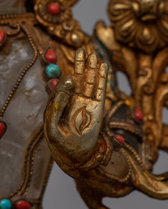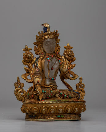 The White Tara Statue Crystal is a magnificent combination of spiritual symbolism and artistic craftsmanship. This statue is painstakingly carved by hand using copper and crystal and embellished with inlaid turquoise and coral stones. Elevated to a height of 21cm and exquisitely electroplated in gold, it radiates visual beauty and profound spiritual significance.