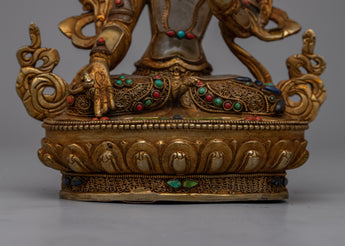 The White Tara Statue Crystal is a focus point for spiritual reflection and reverence, whether positioned as the focal point of a sacred setting, in a meditation area, or as a shrine. In addition to adding to its aesthetic appeal, its fine features and the use of priceless stones give it the mystical characteristics connected to White Tara. This statue, ideal for collectors and practitioners, encourages a closer relationship with White Tara's heavenly attributes and the spiritual core of Tibetan Buddhism.