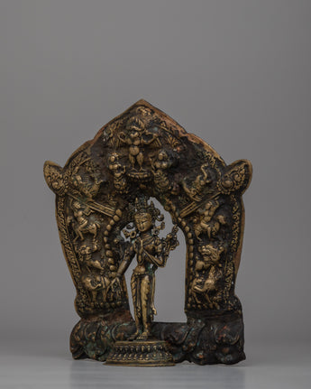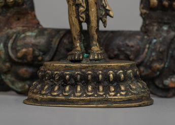 Traditional Buddhist Standing Tara Statue is an excellent item with a durable brass body that demonstrates fine craftsmanship and attention to detail. With a height of 24.5 cm, a width of 23 cm, and a weight of 1.49 kg, this figure represents reverence and devotion in Buddhist practice. The choice of brass ensures endurance and adds an antique appeal, making it a great object for both spiritual and decorative uses. The statue has great religious significance, acting as both a focal point for meditation and an outlet for creating Tara's blessings.