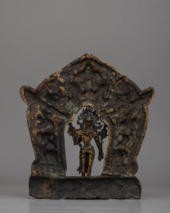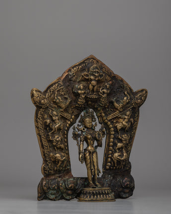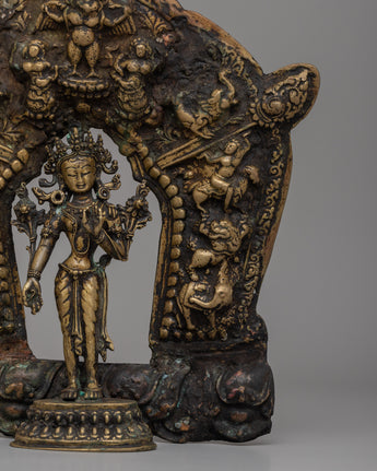 The symbolism of this statue is intricately carved, with Tara serving as the center figure, representing compassion and protection. She is shown in an elegant standing position, conveying peace and divine vitality. Tara's halo is beautifully decorated with sculptures of deities and animals, representing the harmonious connection between the divine and terrestrial realms. These intricate features underscore the notions of wisdom, strength, and connectivity that are important to Buddhist teachings.