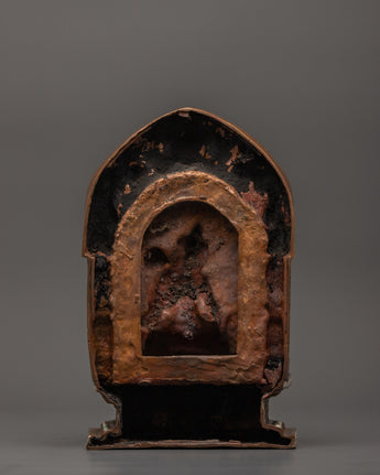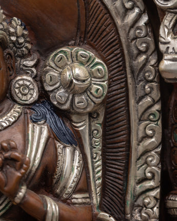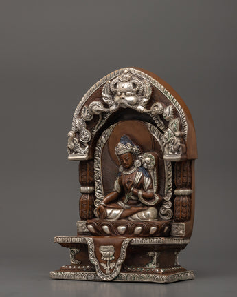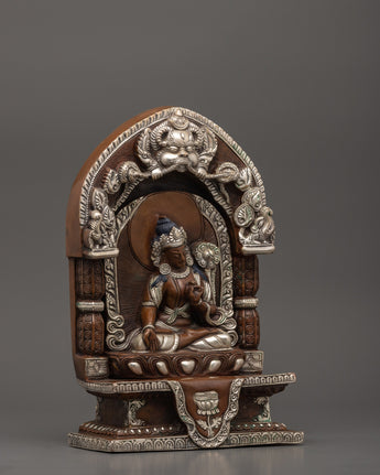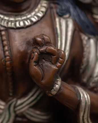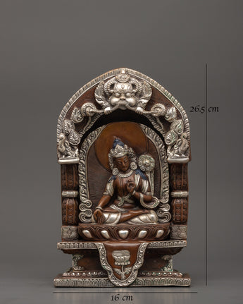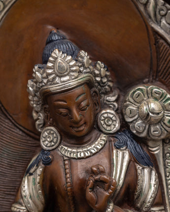 This White Tara Buddhist Deity Statue is a magnificent example of compassion and healing. Crafted from oxidized copper and beautifully silver-plated, this sculpture captures the tranquil and graceful essence of White Tara, a revered figure known for her ability to heal and prolong life. Standing at 26.5 cm tall with a base width of 16 cm, it is an excellent centerpiece for any meditation room or altar. The statue weighs 3.02 kg. White Tara is depicted holding a lotus blossom, symbolizing purity, knowledge, and compassion for all sentient beings.