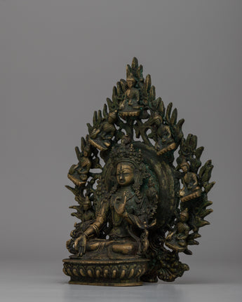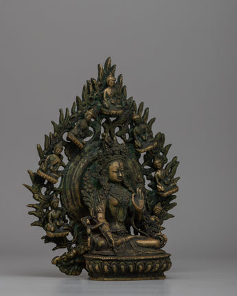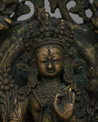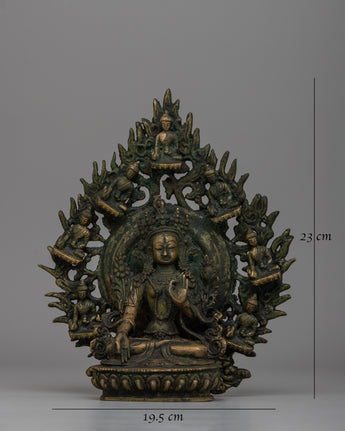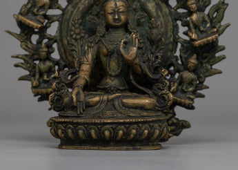 The graceful and calm figure of White Tara stands at the heart of the statue, representing compassion, healing, and long life. Her presence provides peace of mind, representing the divine feminine force that provides protection and wisdom. A halo of seven Buddhas surrounds her, grouped in a fire-shaped design to represent the eradication of ignorance and suffering. The seven Buddhas are carefully positioned, each representing a distinct aspect of enlightenment, such as patience, kindness, and clarity, boosting White Tara's tremendous presence and message.