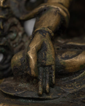 The Tibetan White Tara Buddhist Statue is a beautifully created depiction of compassion and wisdom, manufactured from brass with an antique finish that adds spiritual and aesthetic value. This statue, which stands 23 cm tall and 19.5 cm wide, weighs 1.82 kg and becomes an eye-catching focal point in any spiritual practice room. The brass body, paired with the antique finish, gives the statue an ancient, treasured aspect, conveying a sense of timelessness and veneration that is perfectly suited to its sacred purpose in Tibetan Buddhism.