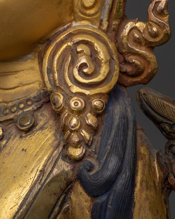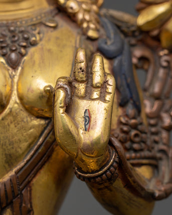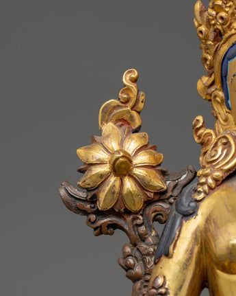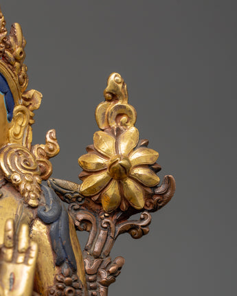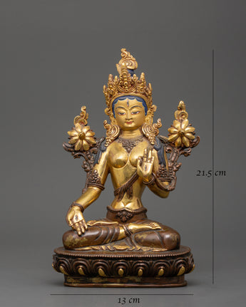 This 21.5cm White Tara Compassionate Deity Statue, made of oxidized copper with a bright gold-plated finish, represents compassion, healing, and longevity in Tibetan Buddhism. White Tara is revered as the Mother of all Buddhas, representing pure wisdom and unbounded love. She is seated in an elegant, meditative pose, radiating peace and divine protection, making this statue an excellent altarpiece for prayers, meditation, and spiritual devotion.