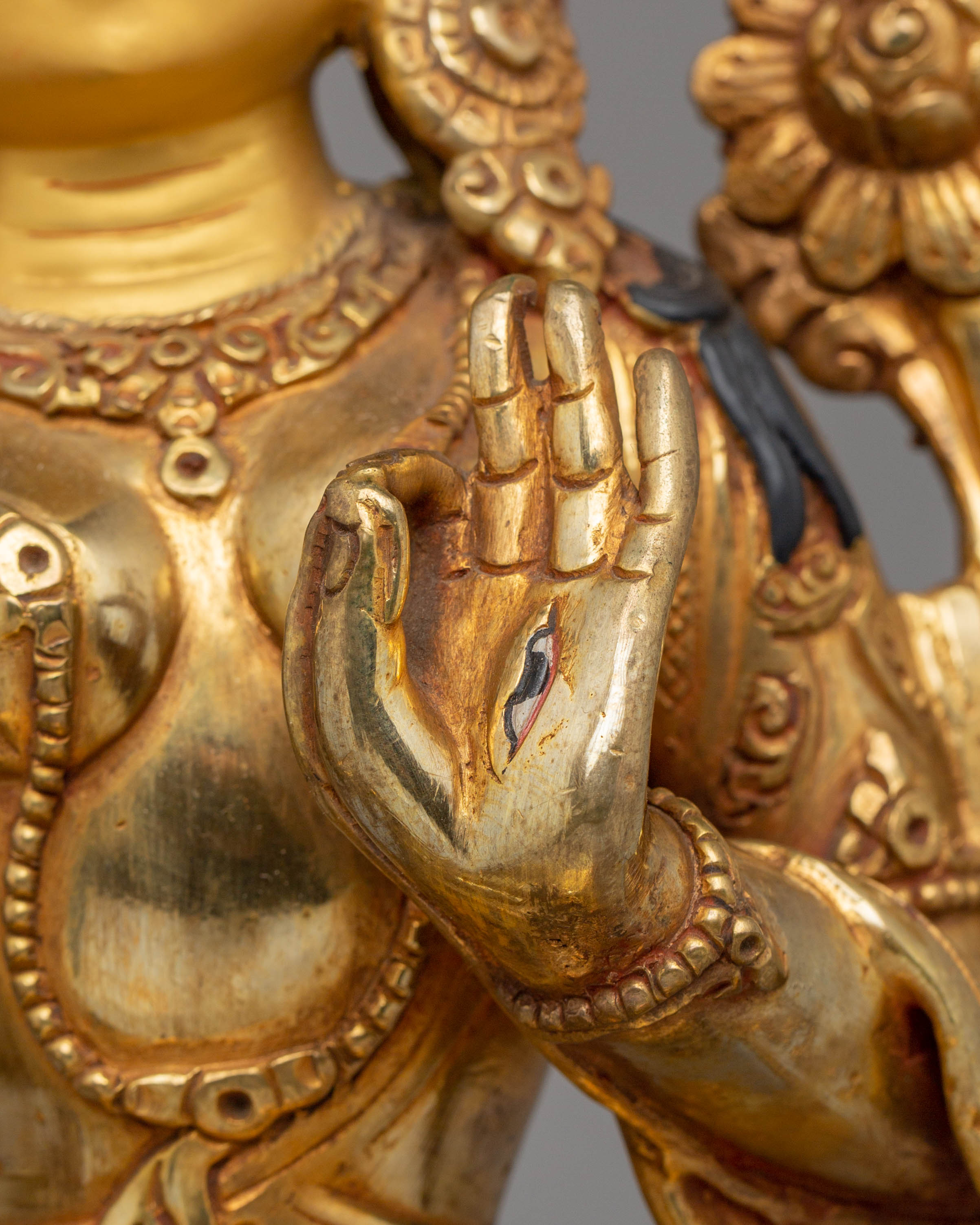 The design of the White Tara statue highlights the serene and graceful nature of the deity, seated in a meditative posture with seven eyes symbolizing her ability to see all beings in need of compassion and healing. The 24K gold gilding enhances the statue’s radiance, symbolizing purity and enlightenment, while the acrylic colors bring vibrant life to Tara's robes and ornaments. The copper body provides a rich, earthy tone, grounding the statue while adding depth to the intricately designed details. This statue beautifully captures the essence of White Tara's compassion and divine presence.