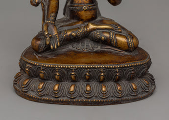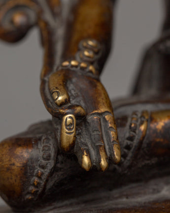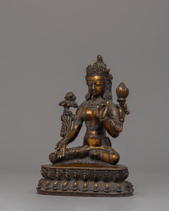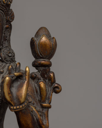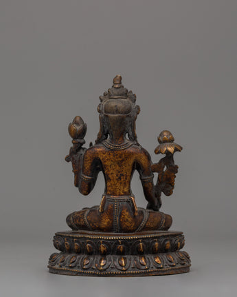 Accept the soothing and loving energy of White Tara, the goddess of longevity and compassion. This elaborately hand-carved statue, made of solid copper and embellished with a timeless antique finish, is an excellent addition to your holy place. The delicate craftsmanship and tranquil stance of White Tara exude serenity and spiritual connection, making it a great centerpiece for meditation or prayer.