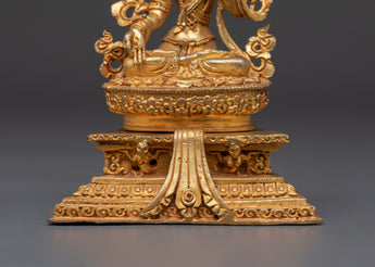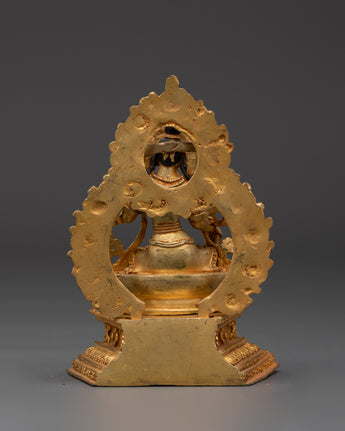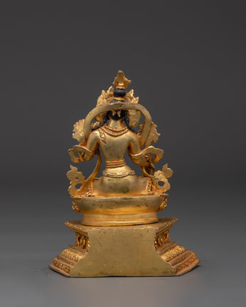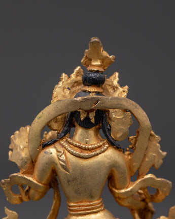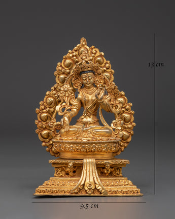 This gorgeous handmade white Tara sculpture represents compassion, knowledge, and healing. Standing 13cm tall, this Tibetan goddess figurine elegantly represents White Tara's tranquil and divine presence, which is recognized for bestowing healing and longevity. This statue, crafted from copper and meticulously gold-plated, exudes a sense of sacredness and peace, making it an ideal complement to any meditation space or shrine. White Tara is renowned in Tibetan Buddhism for her compassion and protective nature; therefore, this sculpture serves as an effective instrument for spiritual development and inner calm.