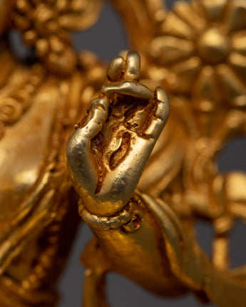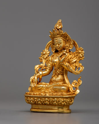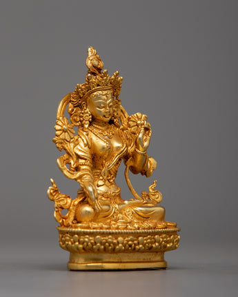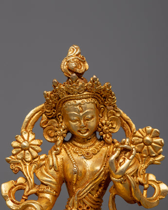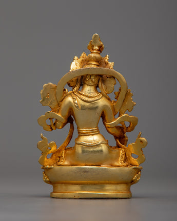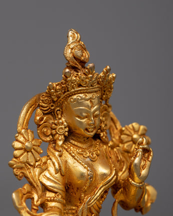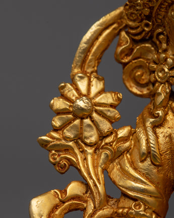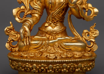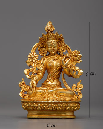 At an elegant height of 9 cm, the White Tara Machine Made Statue represents the caring and compassionate attributes of White Tara, the goddess of longevity and compassion. This monument, which was carefully crafted utilizing machine techniques, perfectly conveys the grace and tranquility of White Tara's heavenly presence. It is made of copper and has beautiful 24k gold plating on it. It exudes spiritual grace and purity.