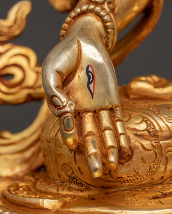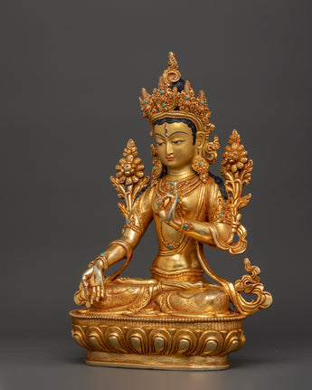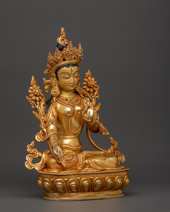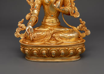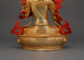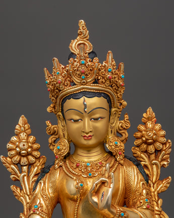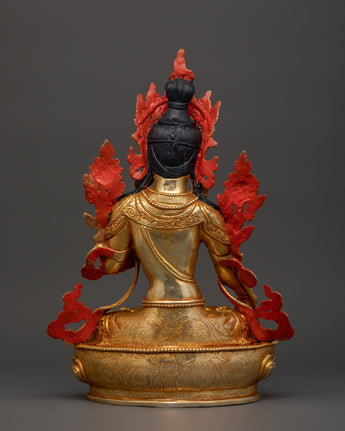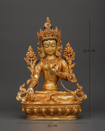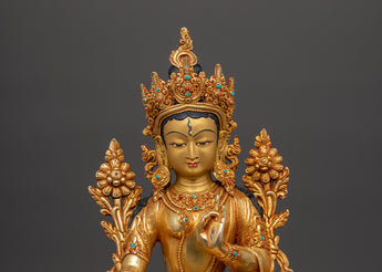 This handcrafted Copper Body White Tara Statue Goddess of Compassion, Healing, Longevity, and Enlightenment, regarded in Tibetan Buddhism as the manifestation of pure feminine energy. This sacred statue, meticulously sculpted from copper and gracefully gold-plated, depicts White Tara's tranquil and compassionate presence, seated in a meditation of peace and grace. The statue, adorned with coral and turquoise stones traditionally connected with protection and healing, has a relaxing and spiritually uplifting energy. It measures 33.5cm in height and 25cm in width and functions as a profound spiritual object and a visually appealing décor piece.